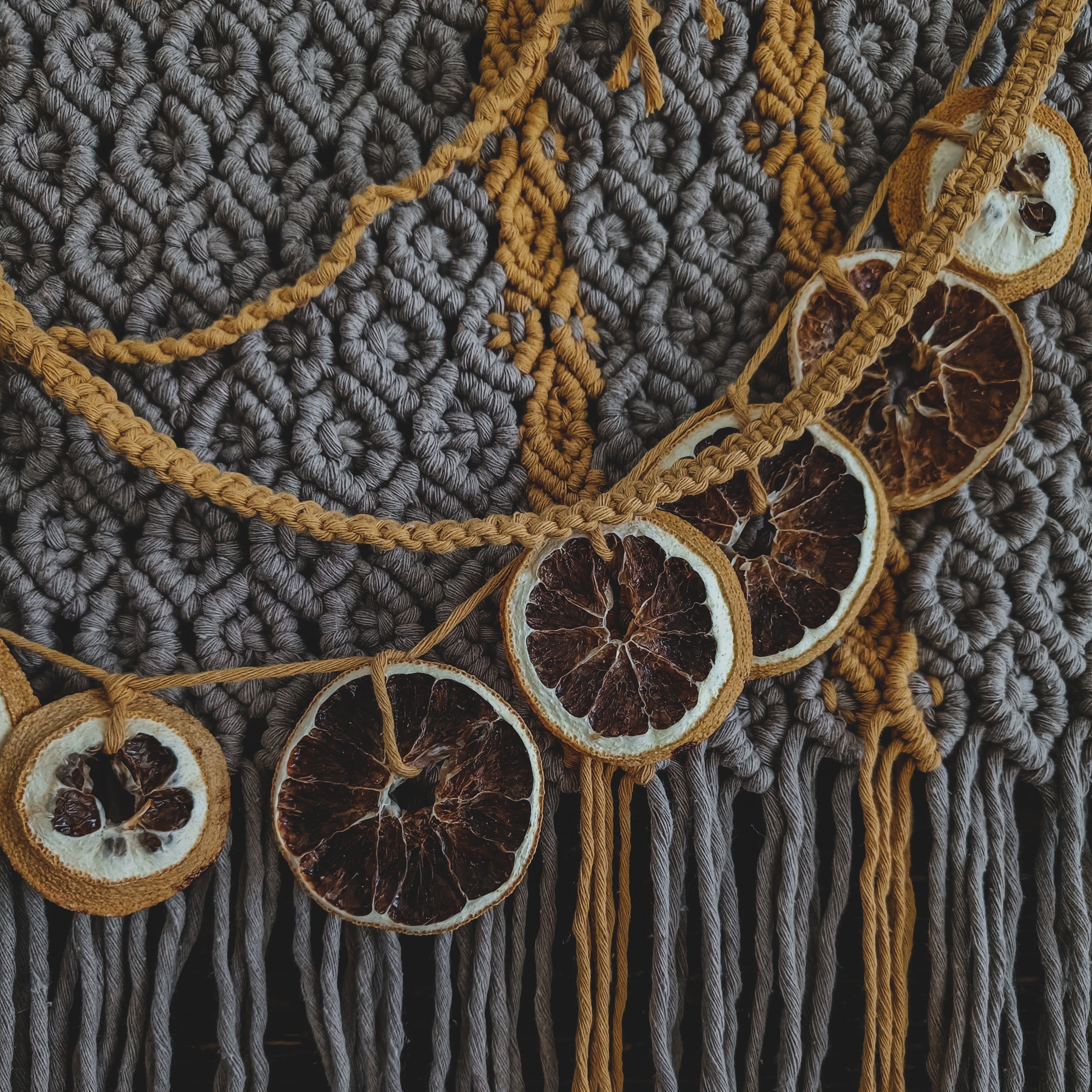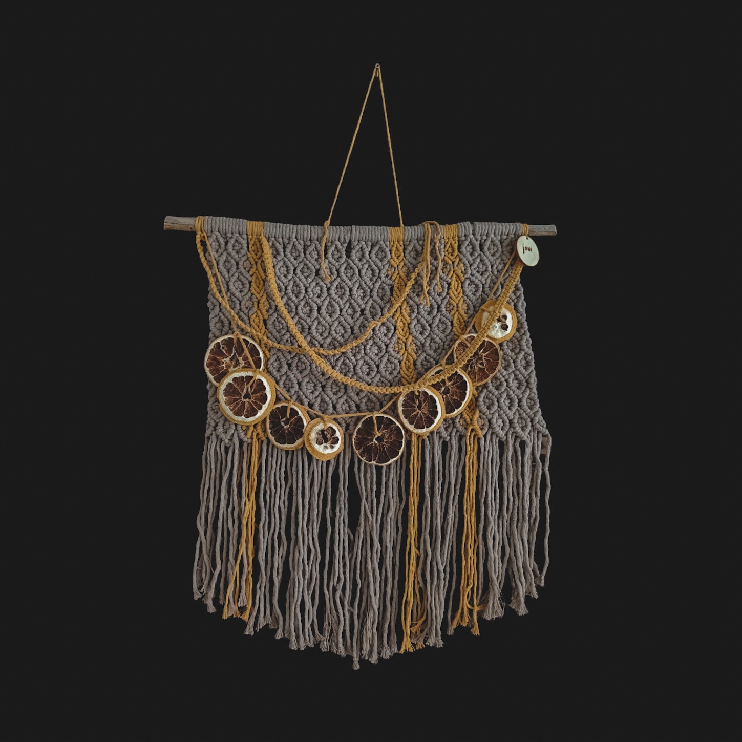 Juhannusyönä valmistunut Juhan on sinapinkeltaisen sekä vaaleanruskean/beigen makramekuvion yhdistelmä. Käytetty lanka on 80% kierrätyspuuvillaa.