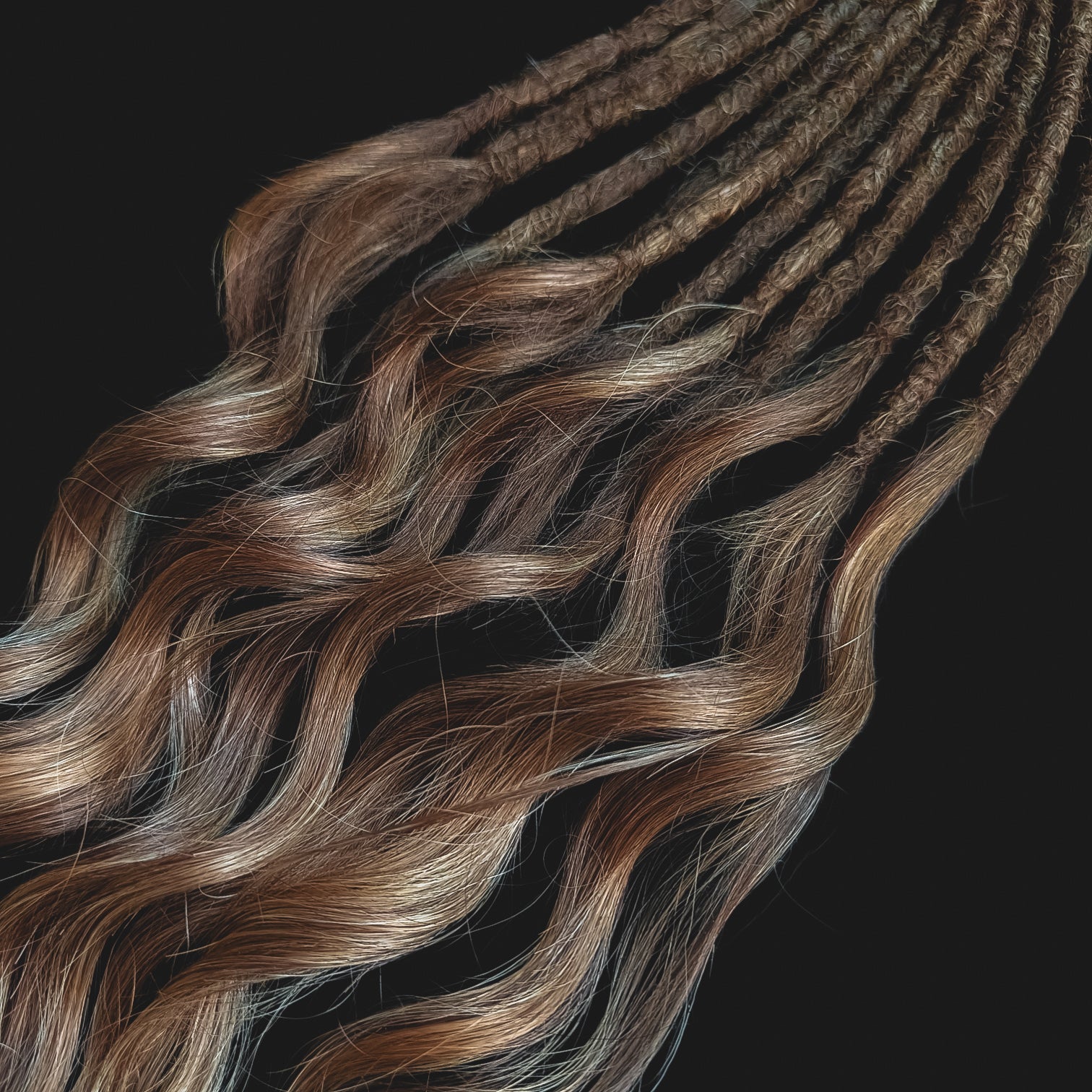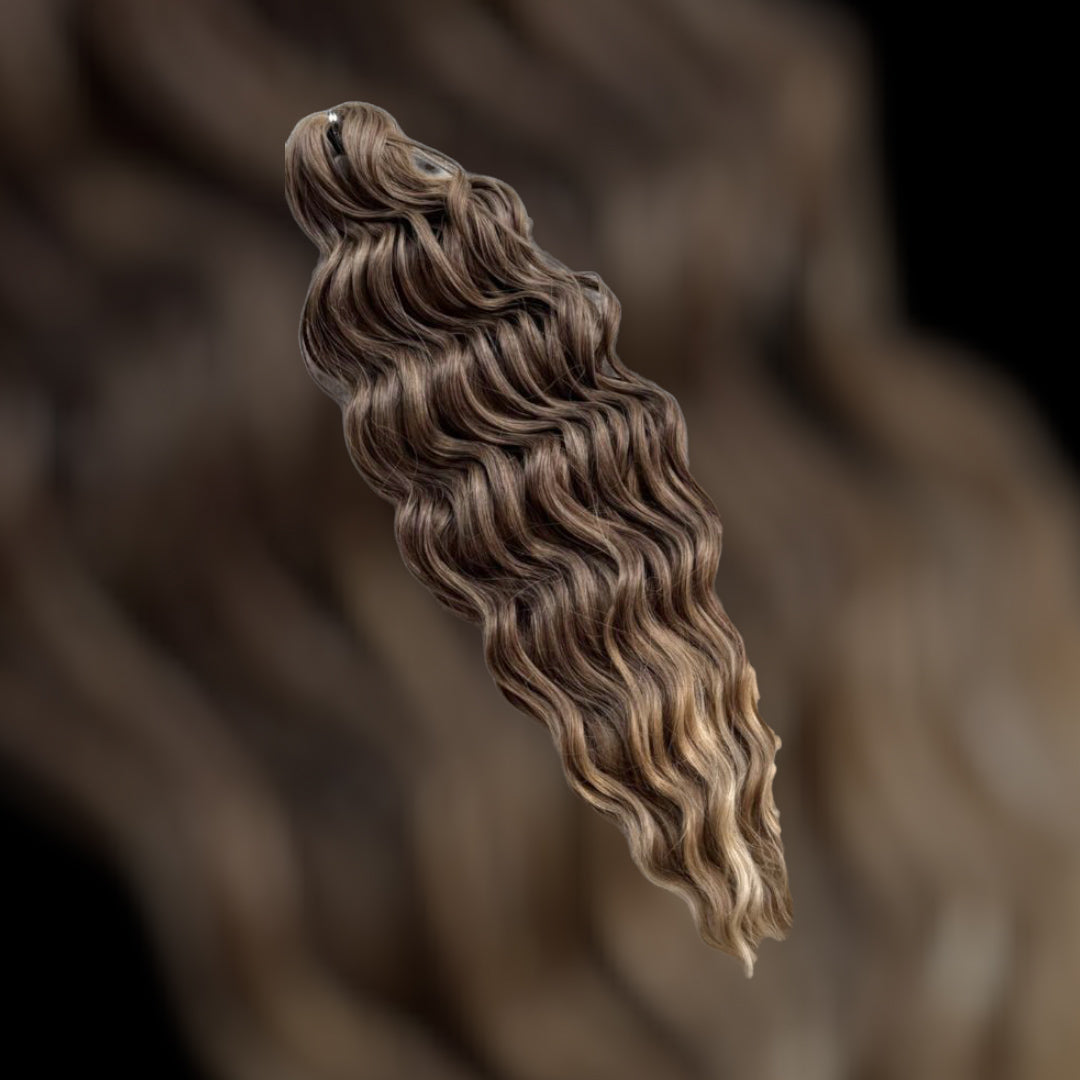 Pitkät laineikkaat Loose end -latvat. Avoin latva n. 35-40cm koko takun pituudesta.